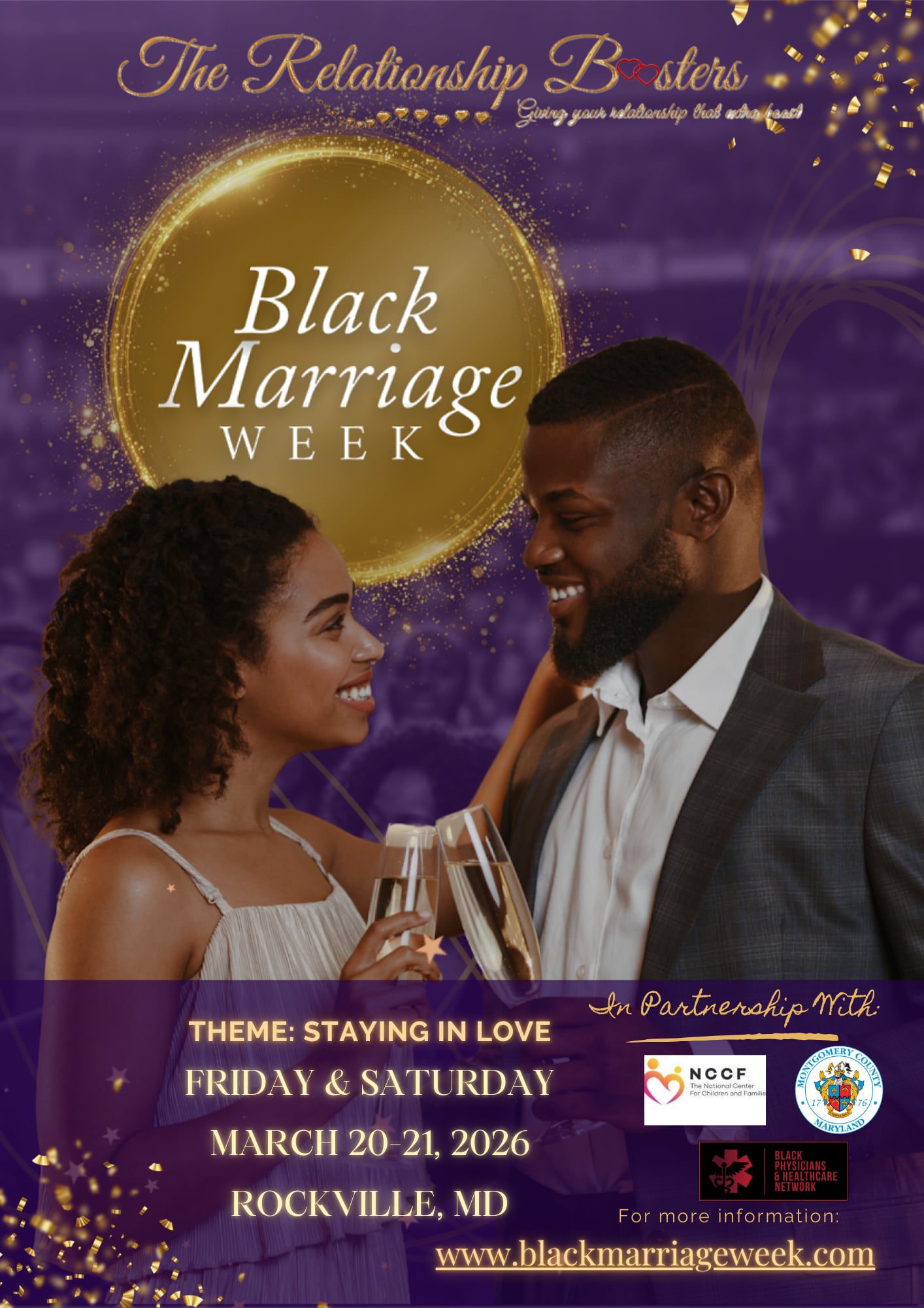 Rockville, Maryland – A conference aimed at strengthening Black marriages is scheduled to take place at the Hilton Washington DC Rockville Hotel and Meeting Center from to . The event, titled Black Marriage Week, is a collaborative effort between Montgomery County, the Black Physicians Healthcare Network (BPHN), and the National Center for Children and Families (NCCF).