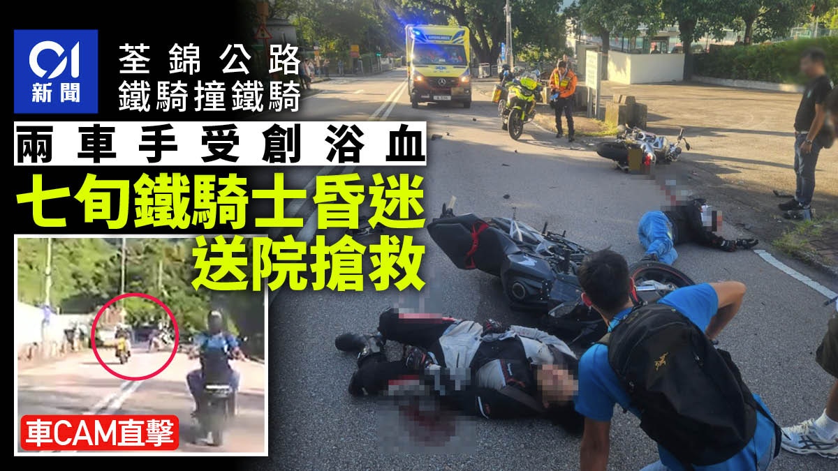 Two electric motorcycles collided on the Quanjin (or Tsuen Jin) Highway in Hong Kong. Both riders were injured, and at least one was found unconscious and has been sent to the hospital. The scene involved both motorcycles falling to the ground, with reports of blood.