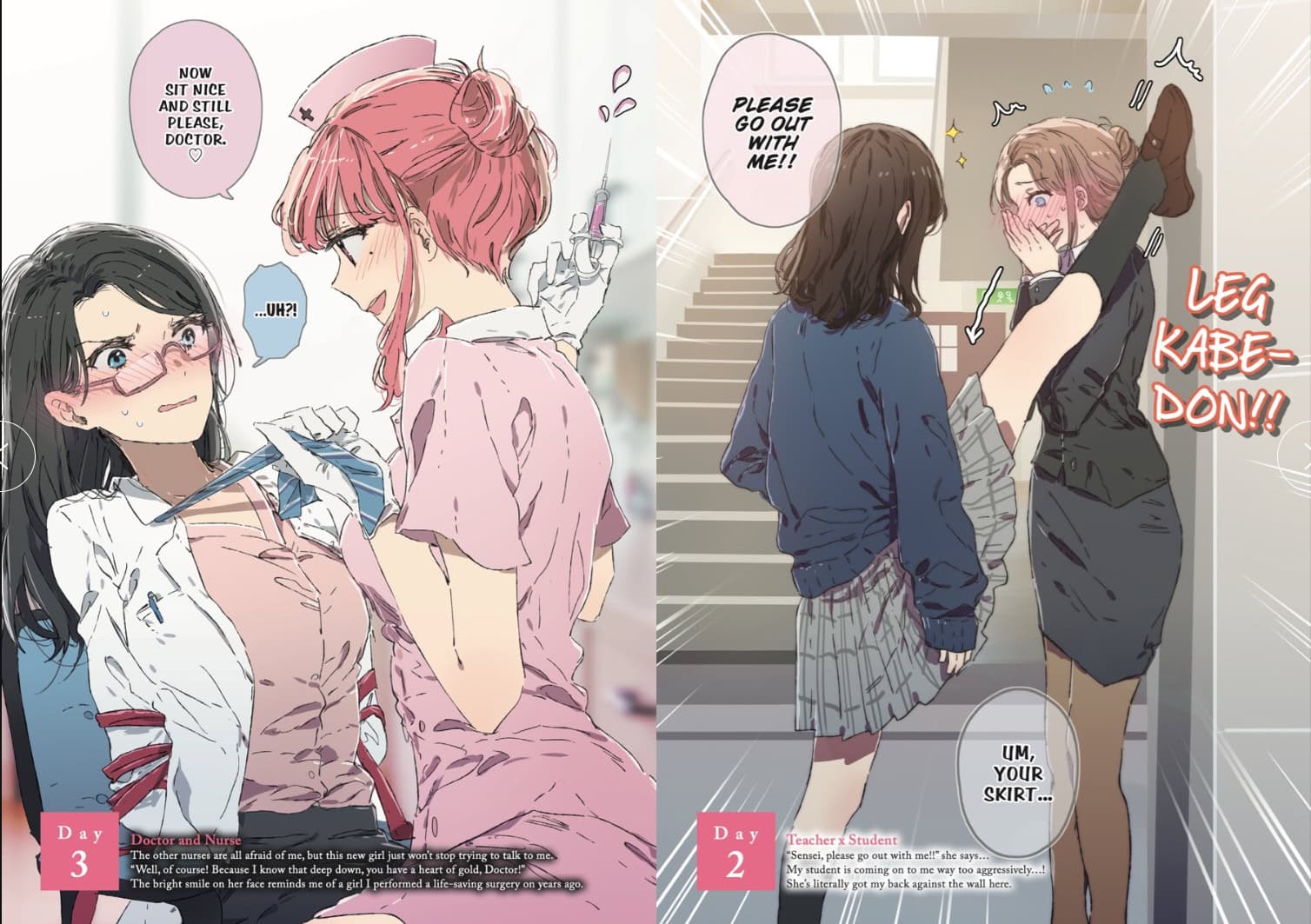 The narrative style is deliberately varied. Some entries consist of a single page, featuring one image and a brief accompanying story. Others expand into multiple panels on a single page, offering slightly more developed scenarios. The volume is framed by a longer short story at the beginning and end, centering on a student’s affection for her teacher. This framing device serves as a thematic anchor, as the school setting appears most frequently throughout the collection.
