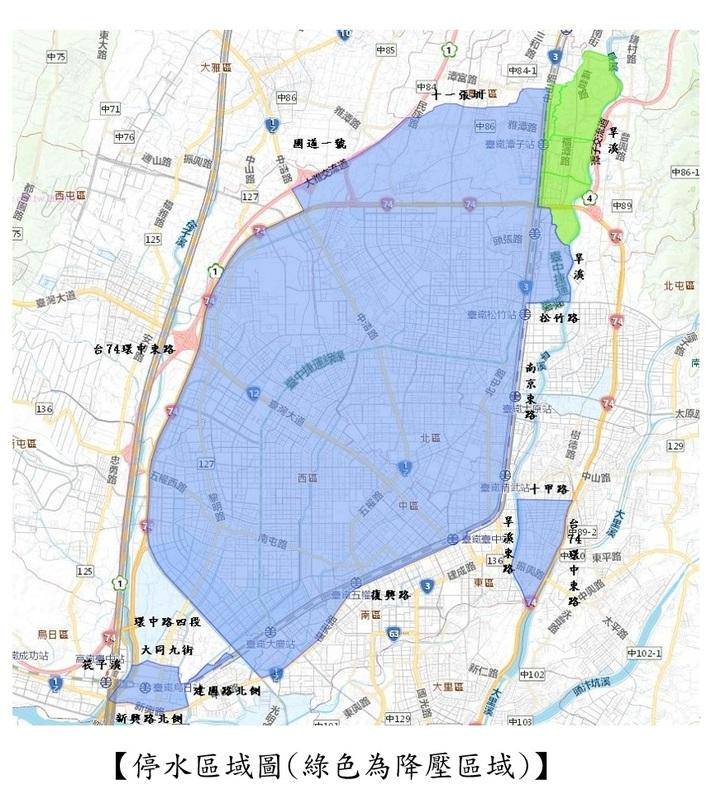 Taichung’s water outage covers up to 11 administrative districts, with green areas indicating reduced pressure. Photo: Taichung City Government/Provided