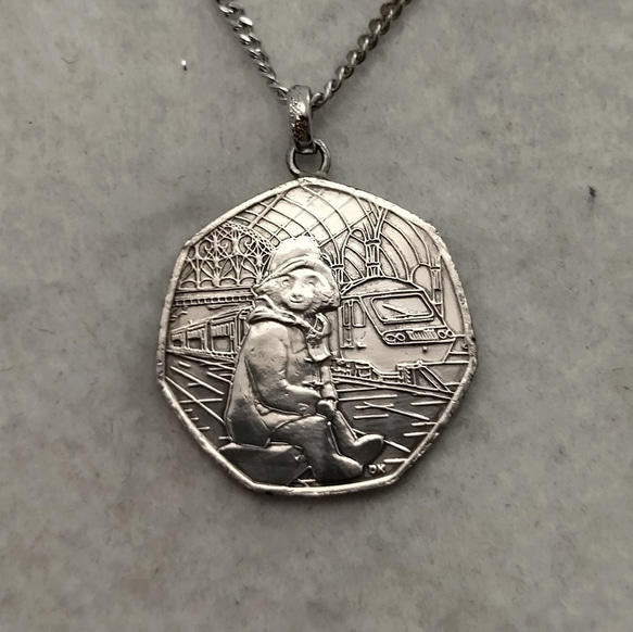 Paddington sitting on a suitcase British coin necklace