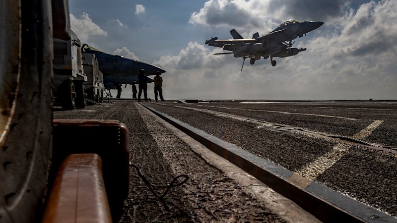 An EA-18G Growler landing on the flight deck of the USS Abraham Lincoln in the Indian Ocean.AP