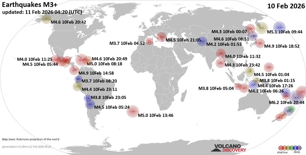 A flurry of seismic activity was recorded globally on , with a total of 546 earthquakes registered worldwide, according to data compiled by VolcanoDiscovery.com. The events ranged in magnitude from 2.0 to 6.2, releasing a combined energy equivalent to 39,326 tons of TNT – or 2.5 atomic bombs.